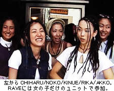 現在は男3(TAKAFUMI / MATSU / OTOOTO)、 女5(AKKO / RIKA / CHIHARU / KINUE / NOKO)がフルメンバーです。RAVEに出ていたのはその中の女の子だけのユニット。シチュエーションに合わせてチームを編成しています。N.Yスタイルのハウスをベースに、HipHopやアフリカン、カポエラとか、自分たちの目でみていいと思ったものをとりいれてます。 |