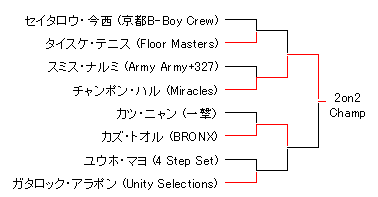 | まずは2on2からバトル開始。今回も日本各地からB-BOY、B-Girlが集まり、予選から激しいバトルが繰り広げられた。予選を勝ち抜いてきた強豪タッグはトーナメント表に示すとおり。 |
