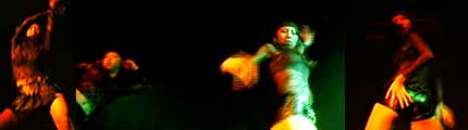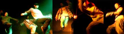 | ラストを飾ってくれたのは、N.Yから来日中のSHAN.S、ハウスダンスを日本に伝えた第一人者KOJI、そして誰もが実力を認めるHIROによる3人のユニット。曲に合わせて自由自在にリズムを取り、「静」と「動」を見事なまでに体現していた彼らのダンスには、座って見ていた前列の人達が無意識に立ち上がってしまうほど。思わず「コレこそがハウスダンスだ」などと語り初めてしまいそうなほど見ごたえのあるパフォーマンスで、文句なしにこの日のNO.1チーム。ビデオを撮っていた人も多かったが、かなり貴重なパフォーマンスを録画できたのではないだろうか。 |