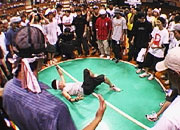 BBOYグループバトル予選では合計5分間をそれぞれ交代で展開していくルール。休憩時間には熱いフリーサークルバトルも行われていた。 |