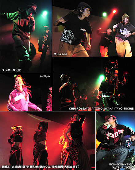 | 2005年12月で4周年を迎えたDAB DAB。今回は何故かJAZZ系のチームに多く出演依頼していたのだが、ふたを開けてみてビックリ!!様々なクリエイションを、たくさん見ることができた。JAZZの傾向としては、個人が「自己」または「別の人格」を「作品の中で演出される人物」として、完璧な役割を果たす存在となって、表現していく。男性のJAZZダンサーは、昔に比べて本当に多くなったし、その存在がとてもリスペクトされるのは、ダンスシーンの大きな最長の一つだと思う。また、女性のHIP HOPダンサーが、いわゆるGIRLSのスタイルから脱却し、“ダンサー”という意味で、いいスタンツを構成しつつあると感じた。HOUSEは、演出面で総合的にクオリティーを高くしてくるタイプと、自我の存在に対して構成してくるタイプなど、各人に合ったスタンツを、実験したりスタイルにしているダンサーが多くなったと感じた。 |